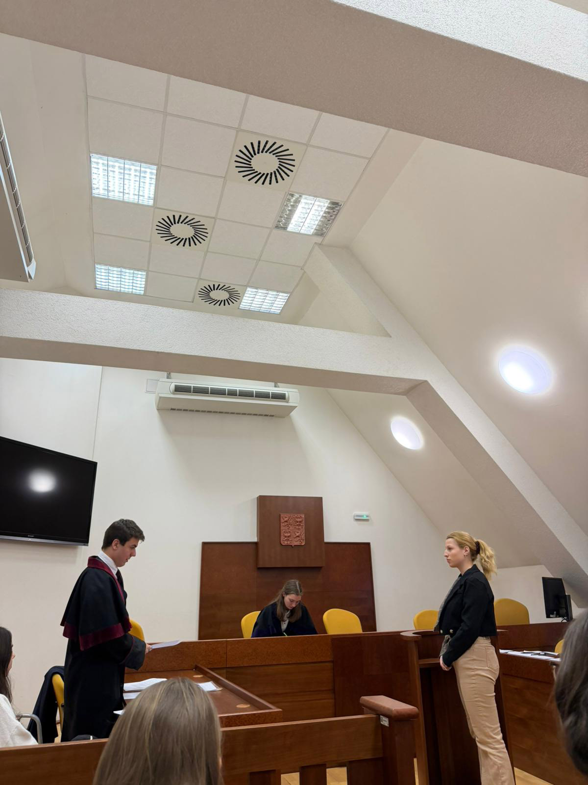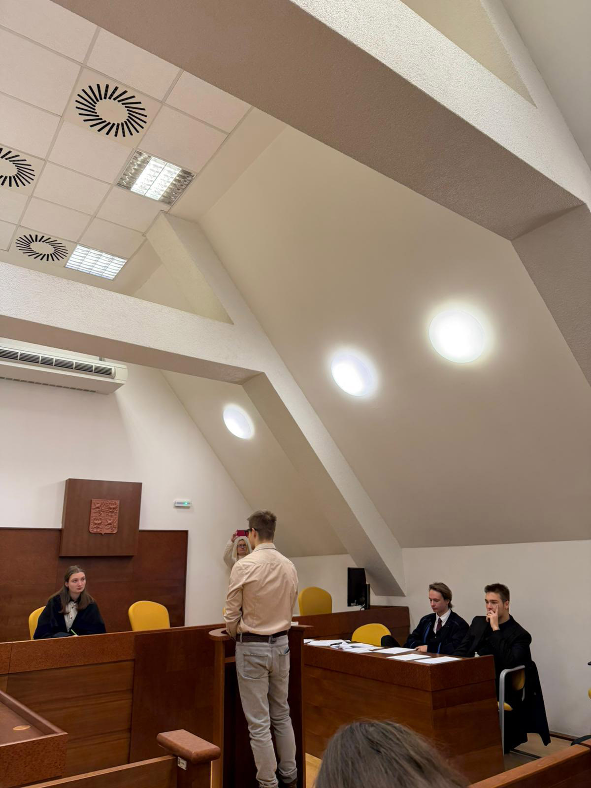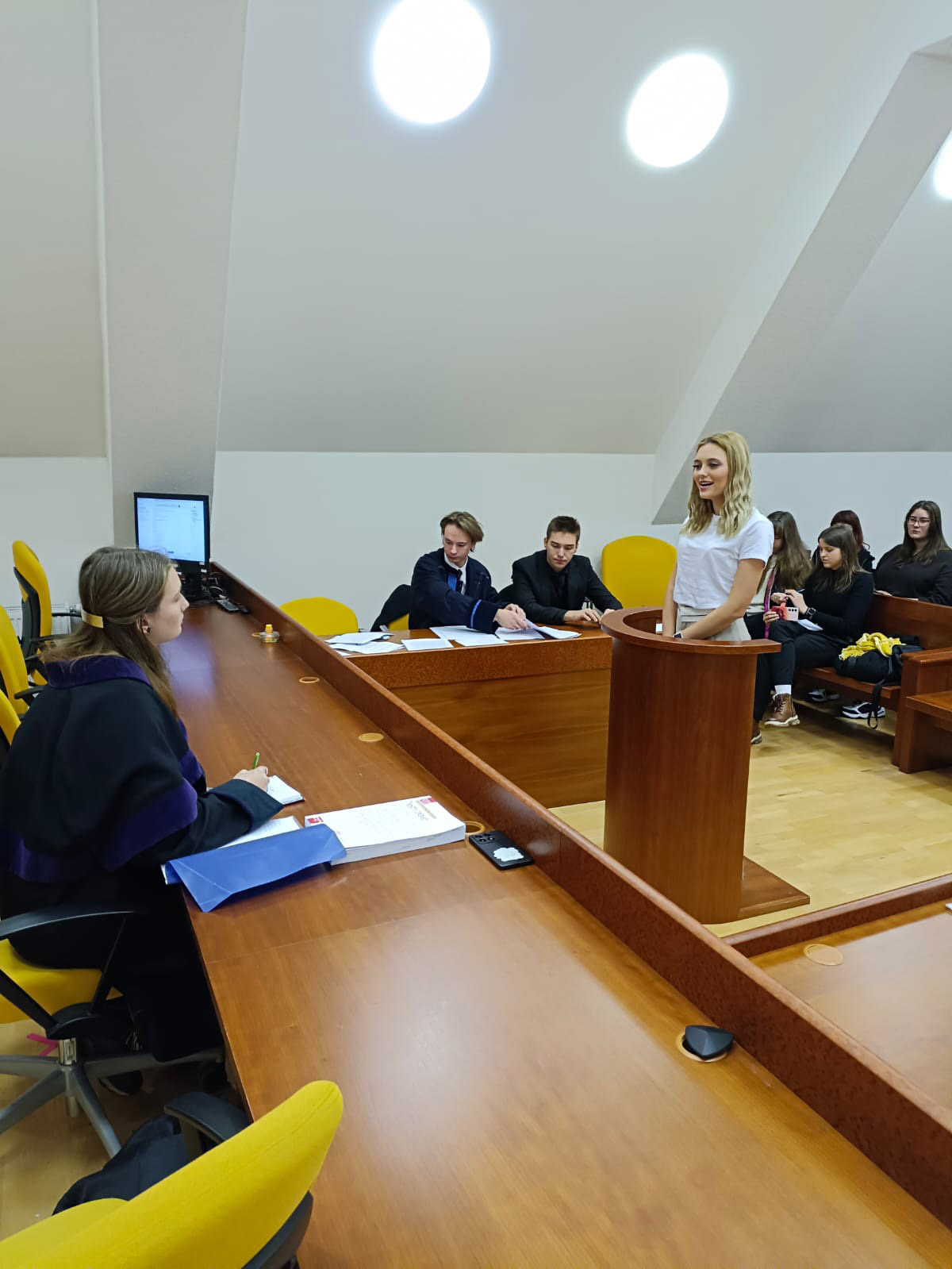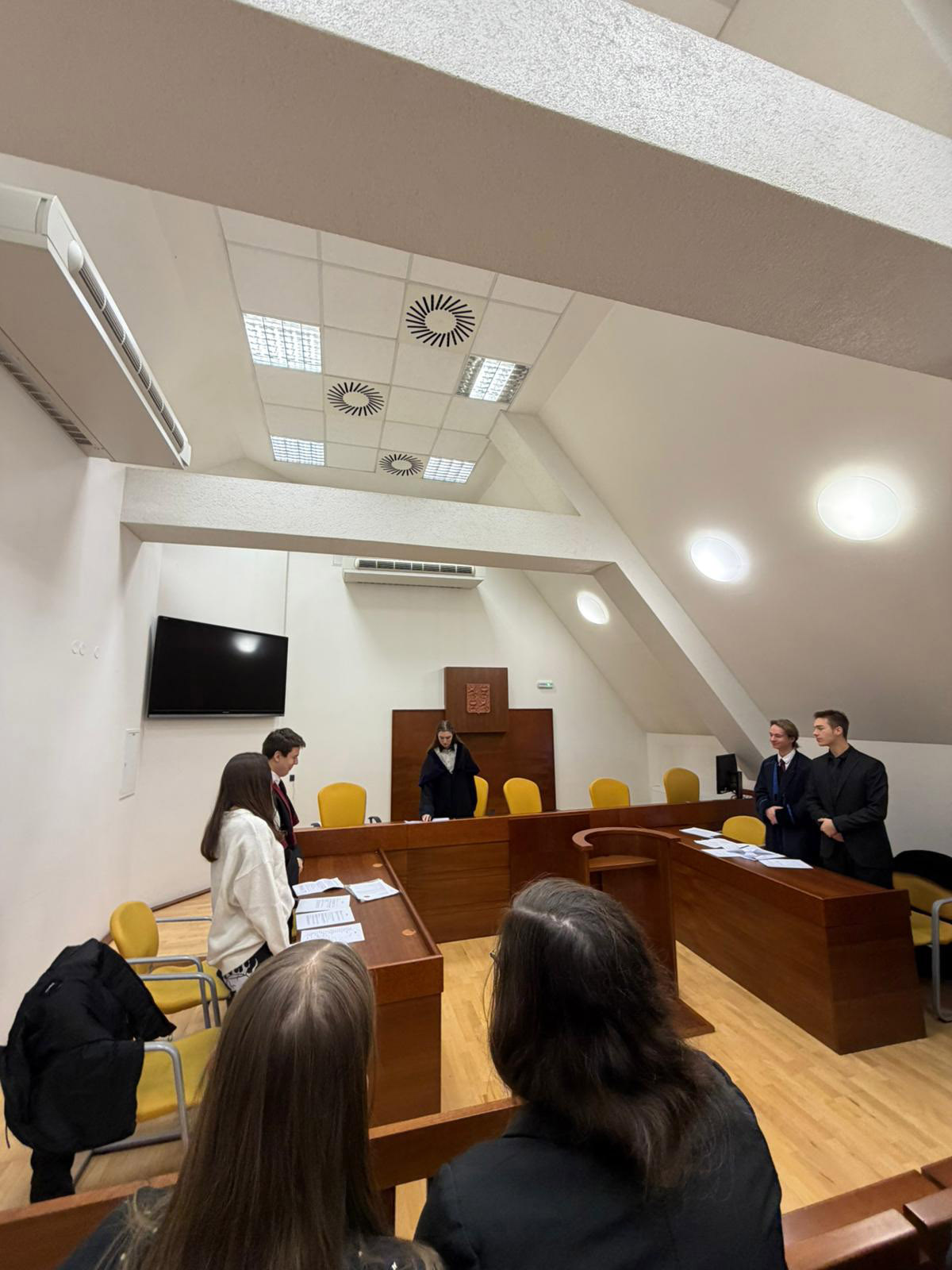 V rámci úspěšně navázané spolupráce s Právnickou fakultou Univerzity Karlovy měli studenti obou třídy nástavby dnes jedinečnou možnost navštívit tuto fakultu a navíc si zde mohli prakticky vyzkoušet zinscenovaný soudní proces. V něm v pozicích soudce, obhájce, státního zástupce, svědků a veřejnosti vystupovali právě studenti a svých roli se zhostili skutečně excelentně!